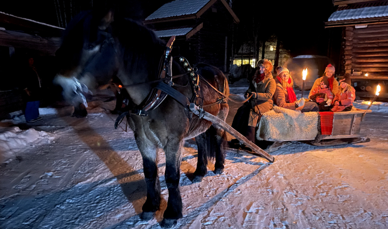 Finns det något mer magiskt än att åka häst och släde genom den djupa skogen, omgiven av facklor och bjällror? Kanske är vägen upplyst av marschaller? Myrängsgårdens vänner, Emelie Snickars och Kuskullan, kommer till gården i sina historiskt korrekta kläder med sina vackra Nordsvenska hästar.